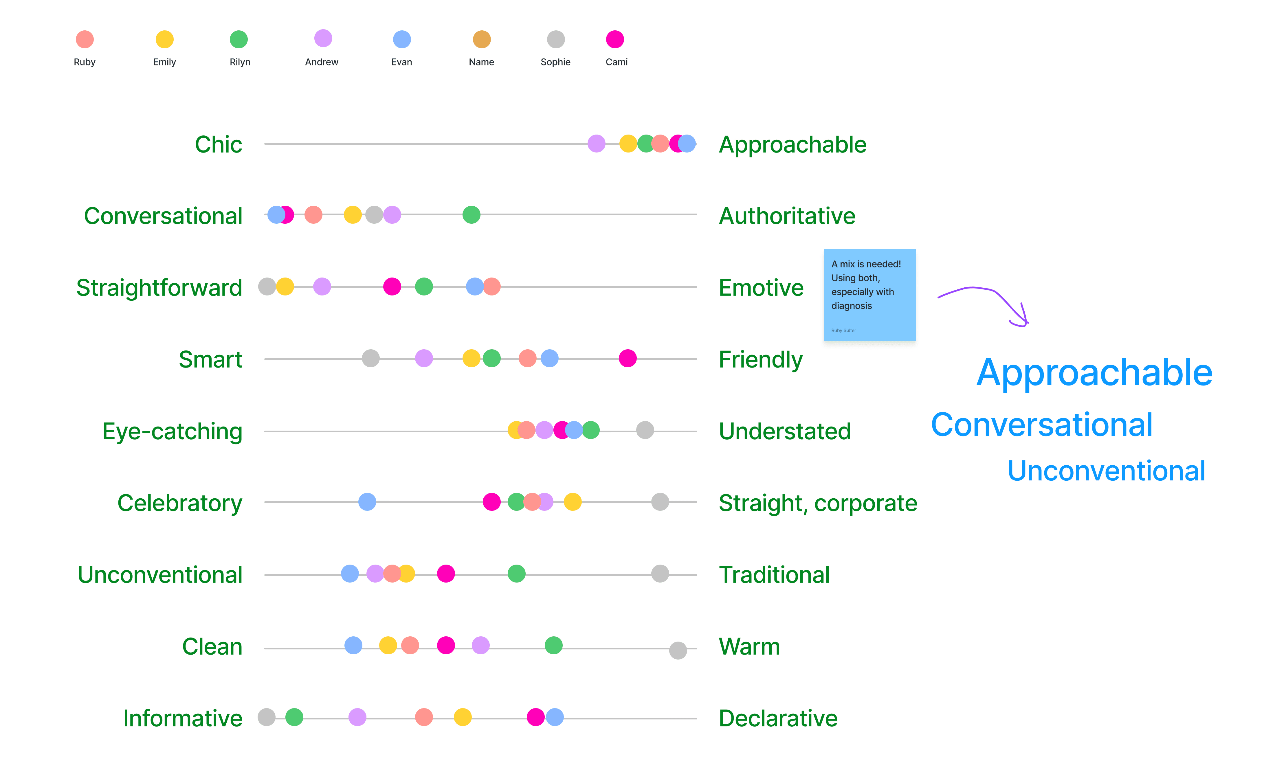 For our first client meeting, the team and client all did the personality levers branding exercise, in which everyone had to use a color dot and put where they think CareWallet would be on the scale.